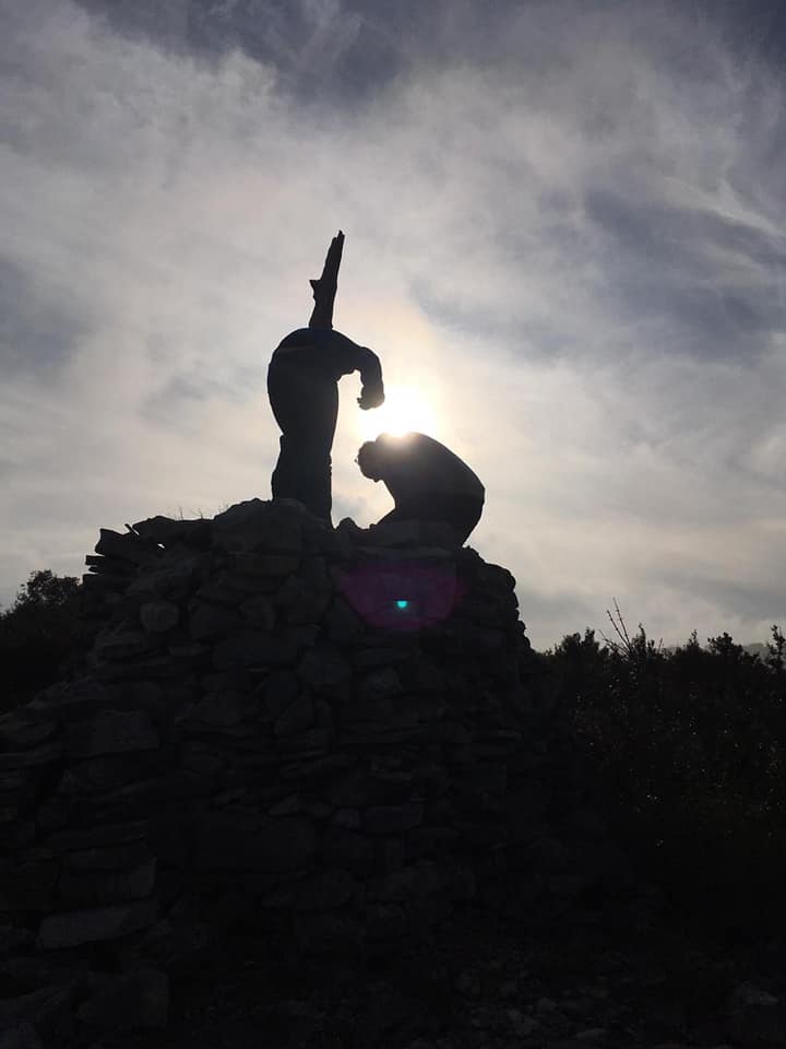 Au premier tiers de l’ascension, on croise un premier monticule de pierre, il y en aura dix-sept en tout. On marche encore un peu et l’on peut se retourner pour voir le village, déjà rétréci par l’éloignement. On repère les maisons de la famille à la présence de l’immense cyprès planté l’année de la naissance de Maman, il y a plus de soixante-dix ans. C’est le moment choisi par les instagrameuses pour préparer leur story avec le paysage grandiose qui entoure le village ; si on a pu partir pour la « golden hour », c’est encore mieux.